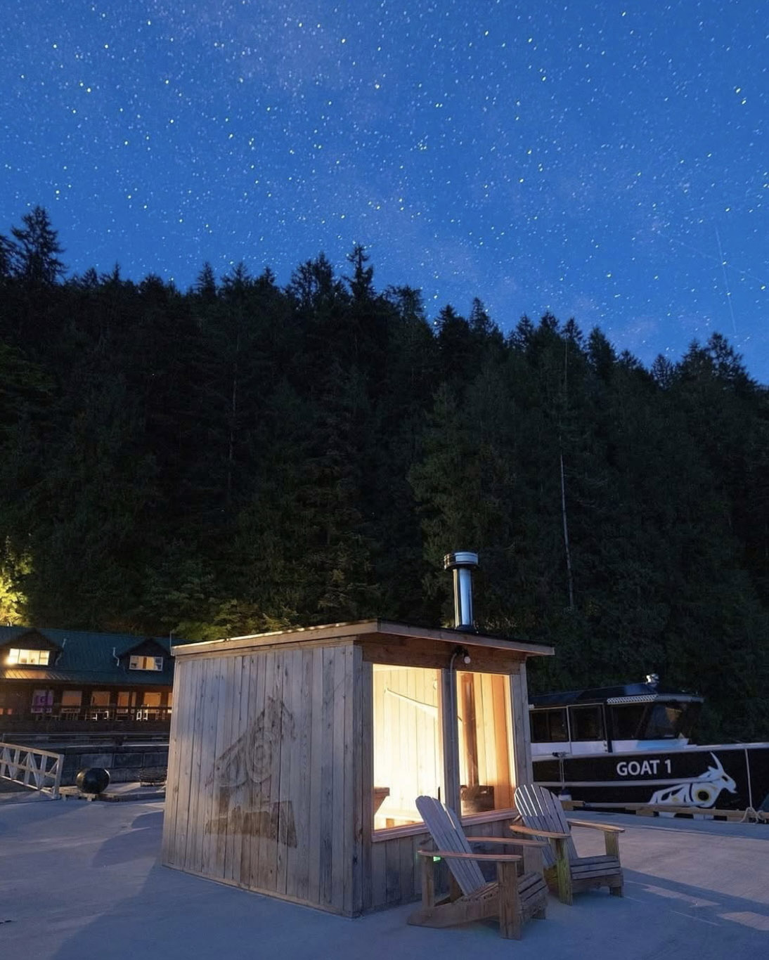 Recent additions to the resort reflect this continued investment in guest experience and environmental design. In 2023, a floating wood-fired cedar sauna was introduced—crafted entirely from Klahoose cedar and positioned on the water for views of the surrounding rainforest and mountains. It joins a newly built floating dock for water sports and a state-of-the-art custom catamaran vessel, “GOAT 1,” offering stable, low-impact marine tours.
