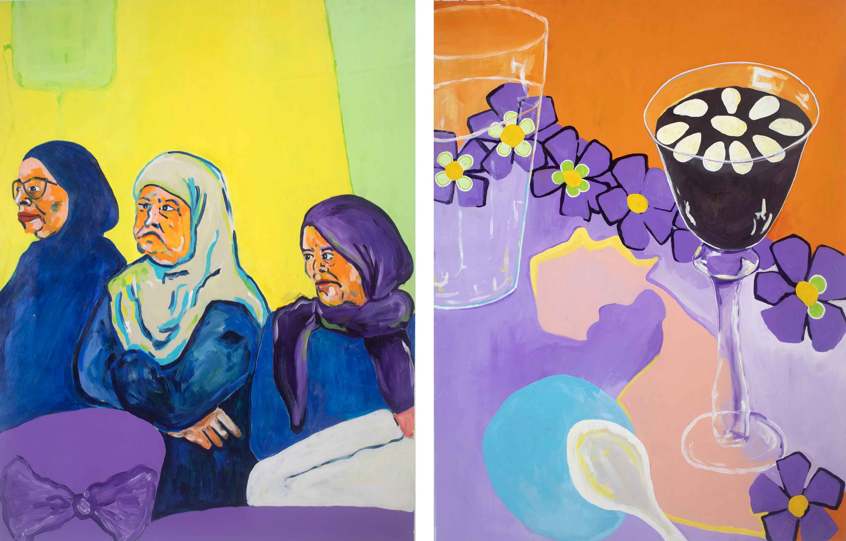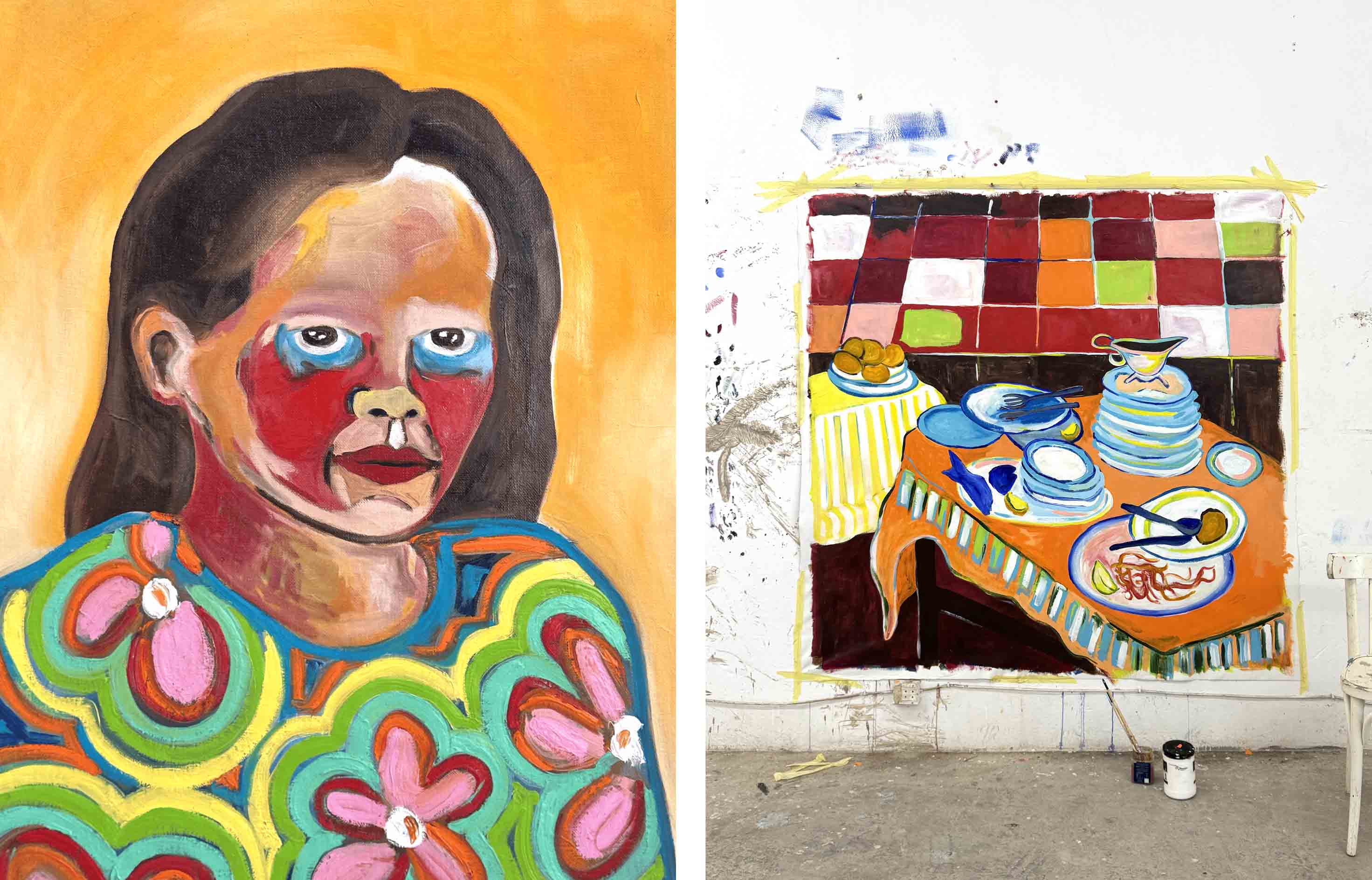 Cheffi’s career has rapidly evolved since she moved from Helsinki to Tunis in 2018. That cultural shift sparked a creative expansion, inspiring her to embrace the chaos, ritual, and sensory abundance of Tunisian life. Her paintings often resemble snapshots of everyday intimacy: a cluttered breakfast table, a wedding celebration, a quiet domestic corner moments made poetic through her intuitive use of color and form. Her 2022 solo exhibition Prestige, a standout project that explored Tunisian wedding traditions through a personal and feminist lens, marked a significant turning point in her practice. It revealed an artist not afraid to explore vulnerability, beauty, and contradiction in equal measure.
