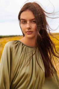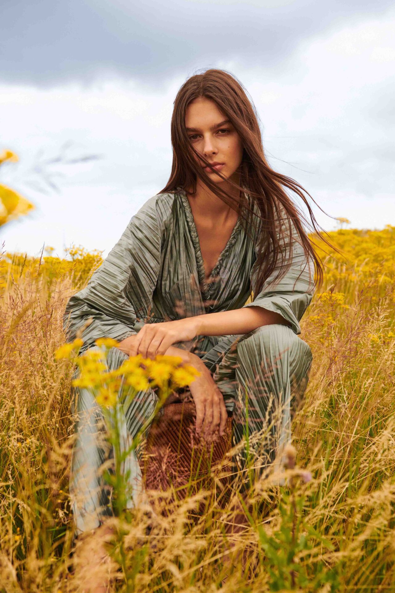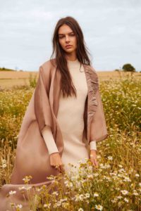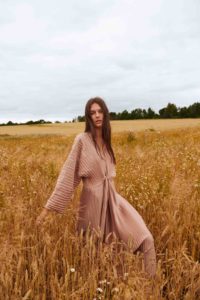 The natural color palette takes inspiration from Turkey, blending soft shades of blush, cream, aqua, moss green, ocean blue and metallic grey. Fabrics sourced from Turkey are soft and luxurious in silk and organza, emphasizing the pared-back aesthetic.