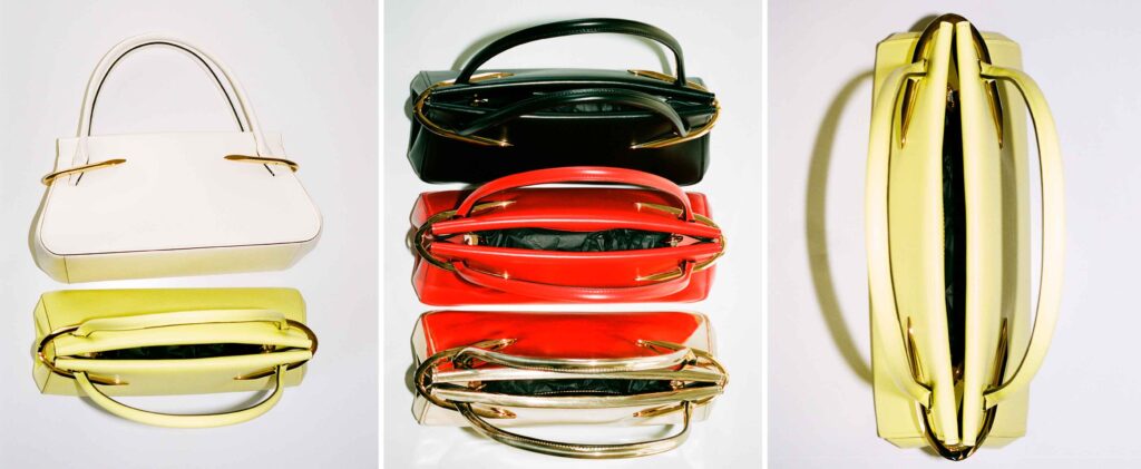 The Pinch is offered in three sizes, in black and ivory, seasonal shades of deep red and acid yellow, and in gold or silver mirror leather. Medium and small versions include a concealed mirror – a discreet detail of utility.
