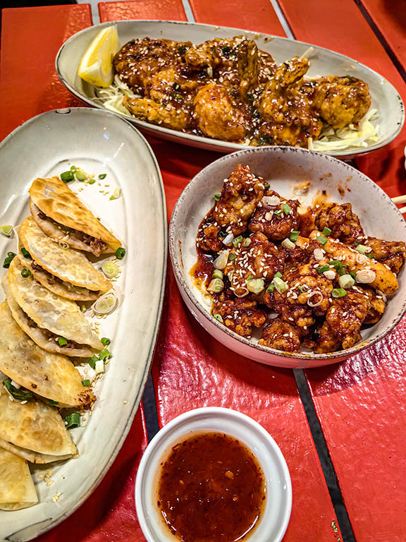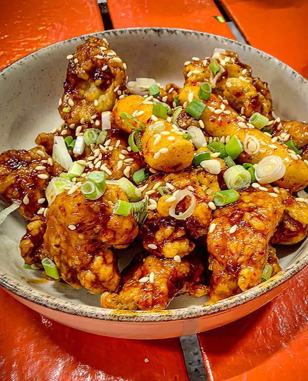 Next came the Seoul Chicken, a dish that quickly became one of the table’s favourites. Fried chicken and rice cakes were coated in a glossy sweet-and-spicy sauce that struck an excellent balance between heat and sweetness. The chicken retained its crispness beneath the glaze, while the rice cakes added their signature chew and turned the plate into something deeply satisfying. It captured the joy of Korean street food with confidence and flair.