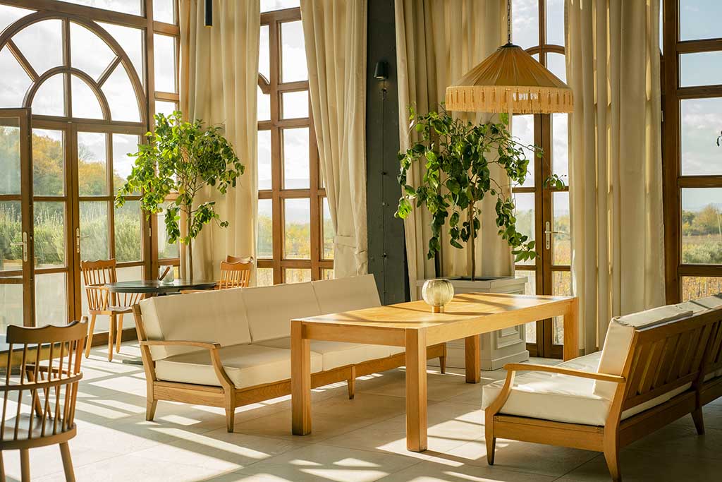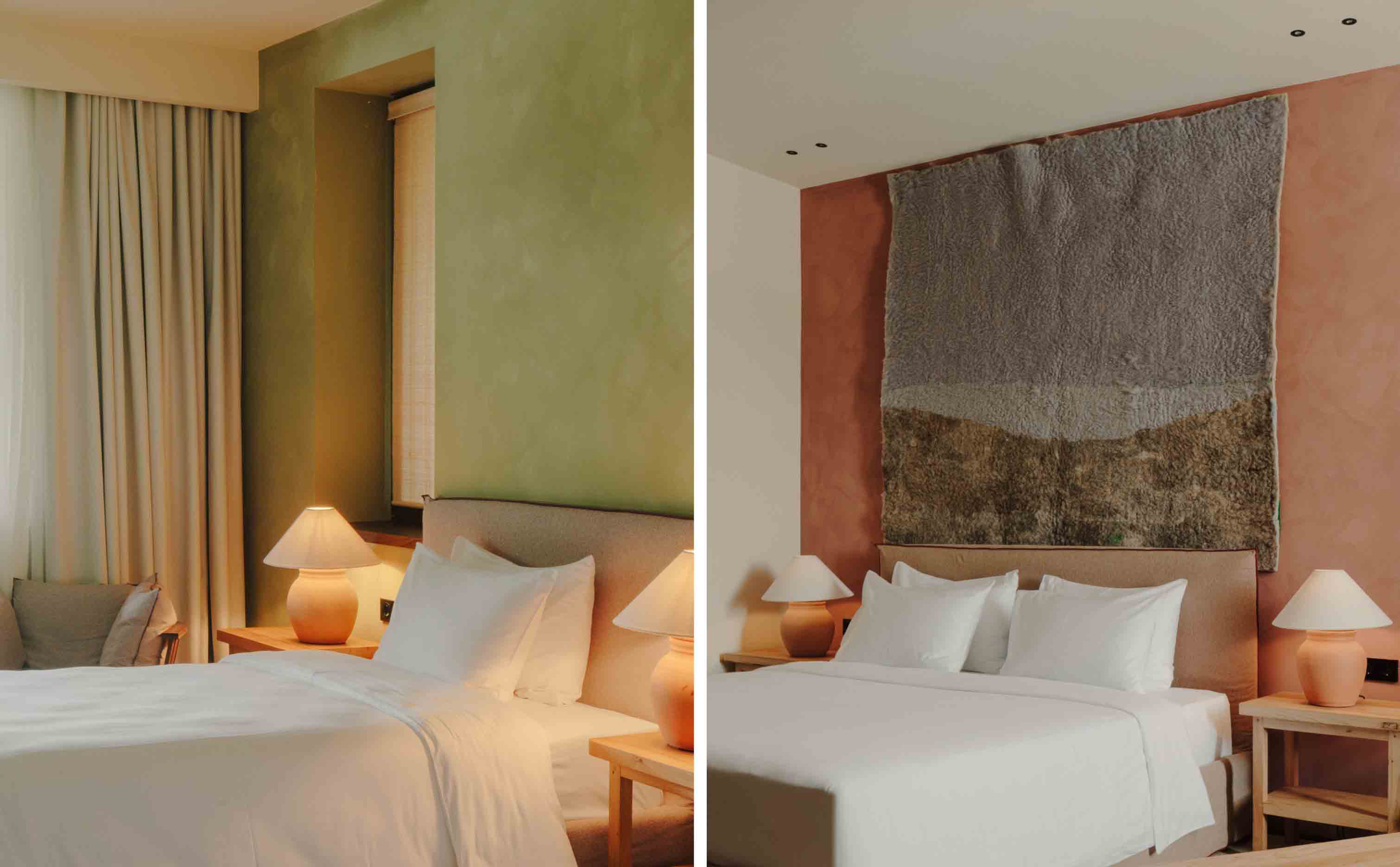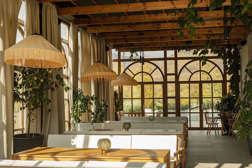 Recent renovations have sharpened the design identity without losing that sense of place. Interiors created by the Tbilisi-based studio 10:10 Interiors draw directly from the surrounding landscape, using natural materials such as clay, wood, linen, felt and woven straw, to create spaces that feel calm, grounded and quietly tactile.