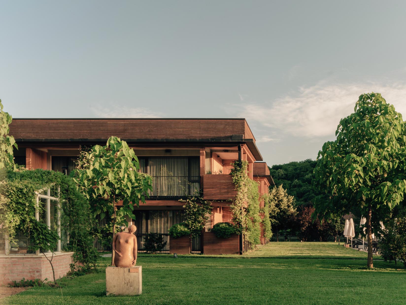 At the heart of the property sits a broad, tranquil lake, its surface often broken only by the occasional ripple of wild geese or the soft sound of frogs after dusk. Around it stretches a 60-hectare estate where vineyards, olive groves and woodland merge into the wider Kakheti countryside. The effect is less that of a hotel complex and more of a self-contained rural village, one where architecture, landscape and daily life seem deliberately interwoven.