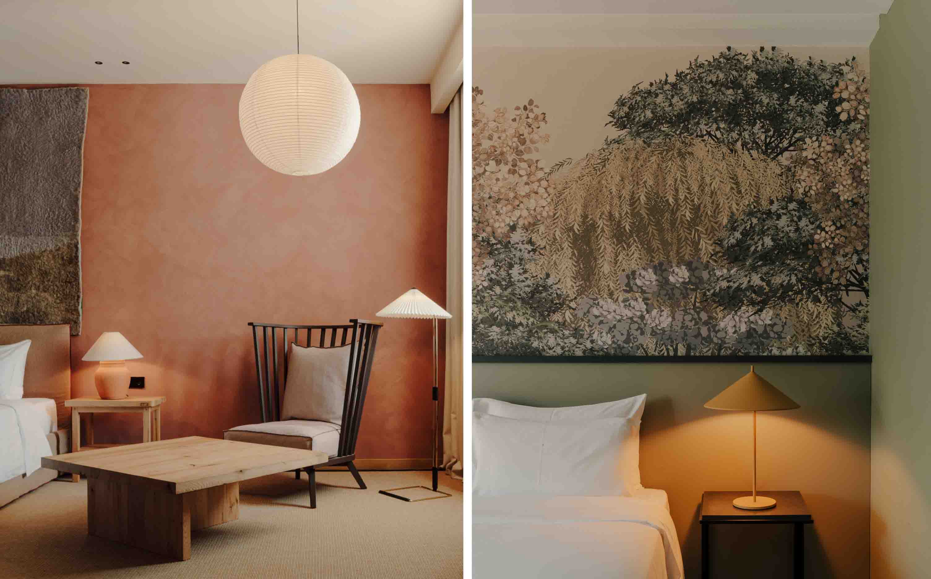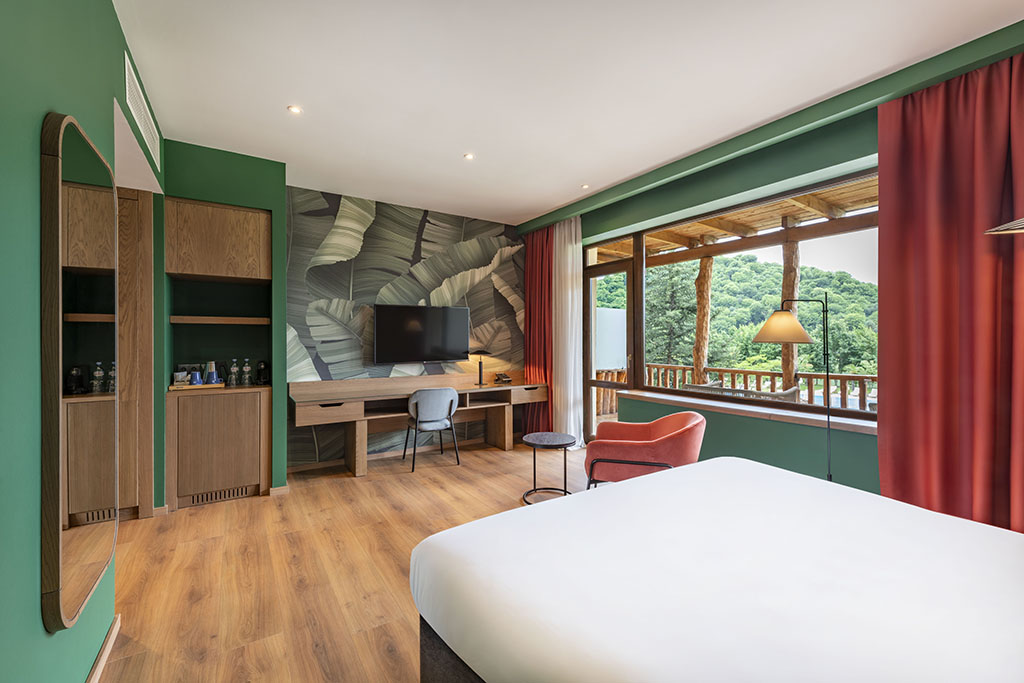 The palette is particularly thoughtful. Some rooms carry a warm, earthy clay tone reminiscent of traditional Georgian ceramic vessels, while others are finished in soft pistachio greens that echo the vegetation surrounding the lake. These colours are not decorative gestures so much as reflections of the environment outside the window. Almost every room opens onto a private balcony overlooking the gardens, vineyards or distant mountain ridges, reinforcing the sense that the outdoors is never far away.