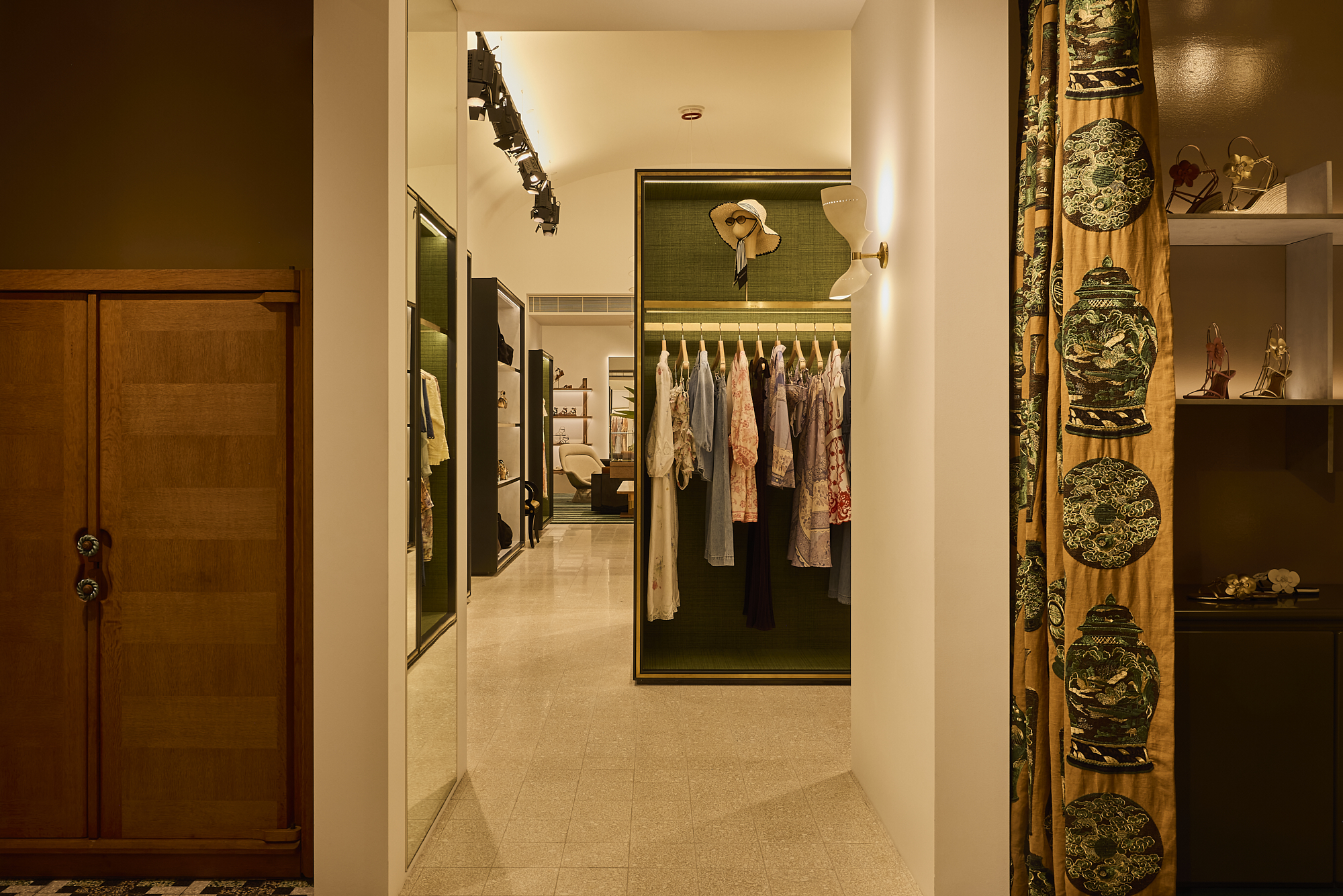 The first space is anchored by a vintage console designed by Alain Delon, with elegant wardrobes presenting clothing and accessories. The second space features carefully crafted niches to highlight the collection. Artworks by André Masson and Australian-based artist, Jordy Van Den Nieuwendijk add to the boutique’s unique identity.