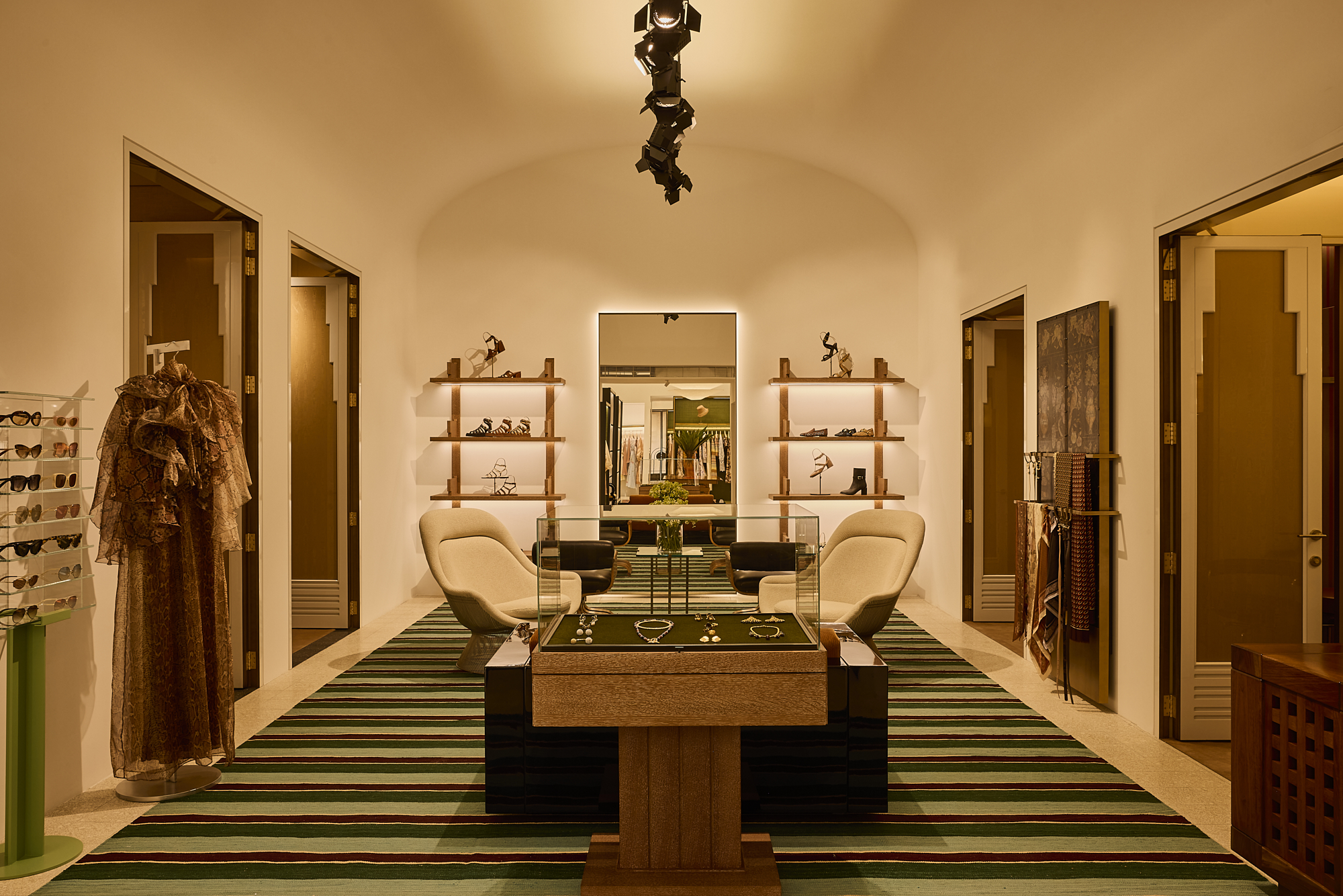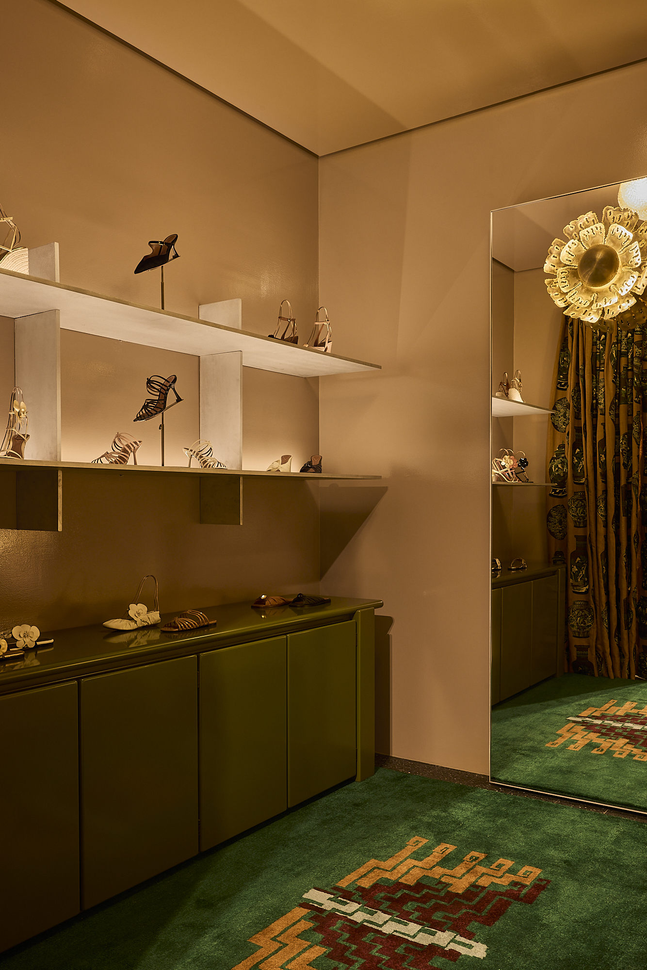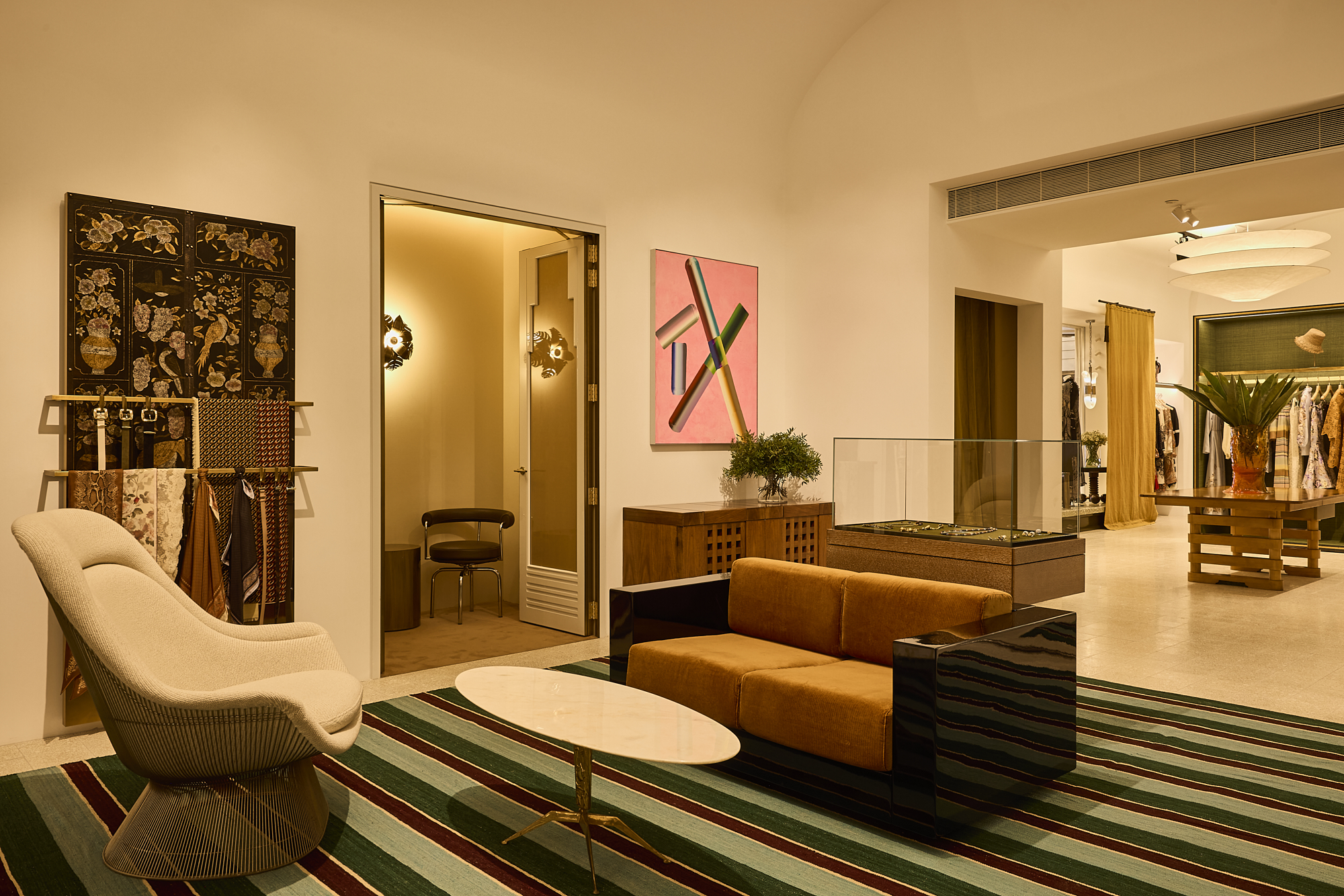 A striking green-and-blue striped rug marks the entrance to the lounge area, where a reupholstered 1970s sofa looks towards full-height timber footwear displays. Privacy is honoured through generous, fabric-lined fitting rooms with dedicated seating and side tables. Soft accessories and belts are delicately displayed on a vintage oriental screen from the mid-20th century.